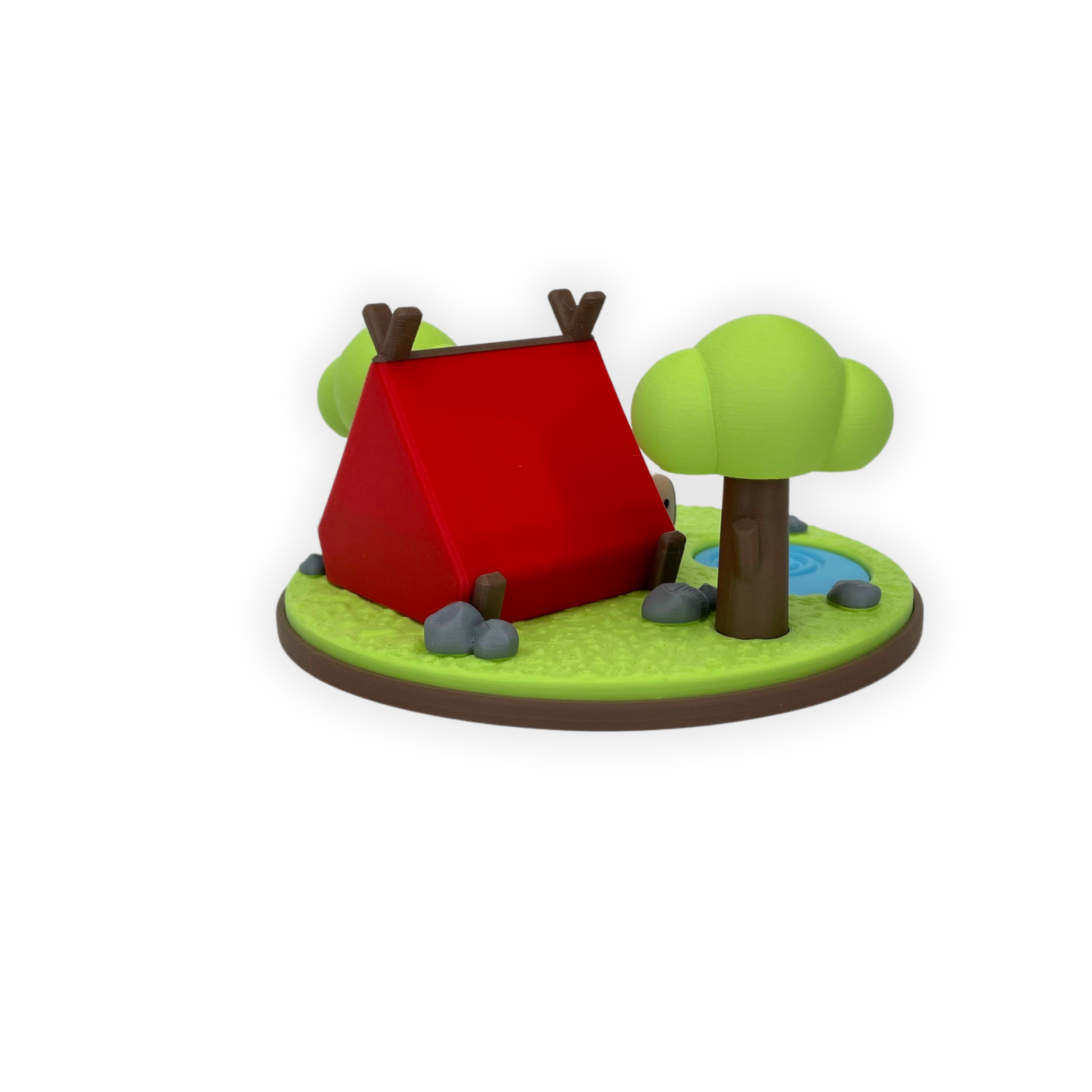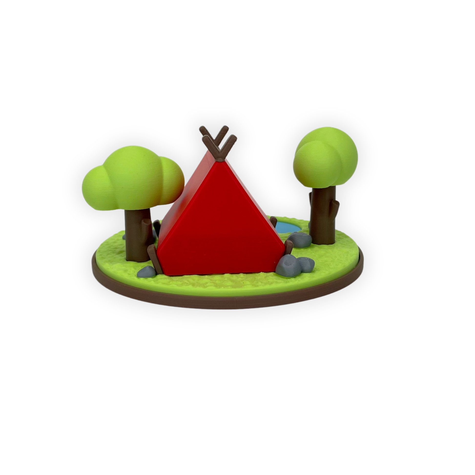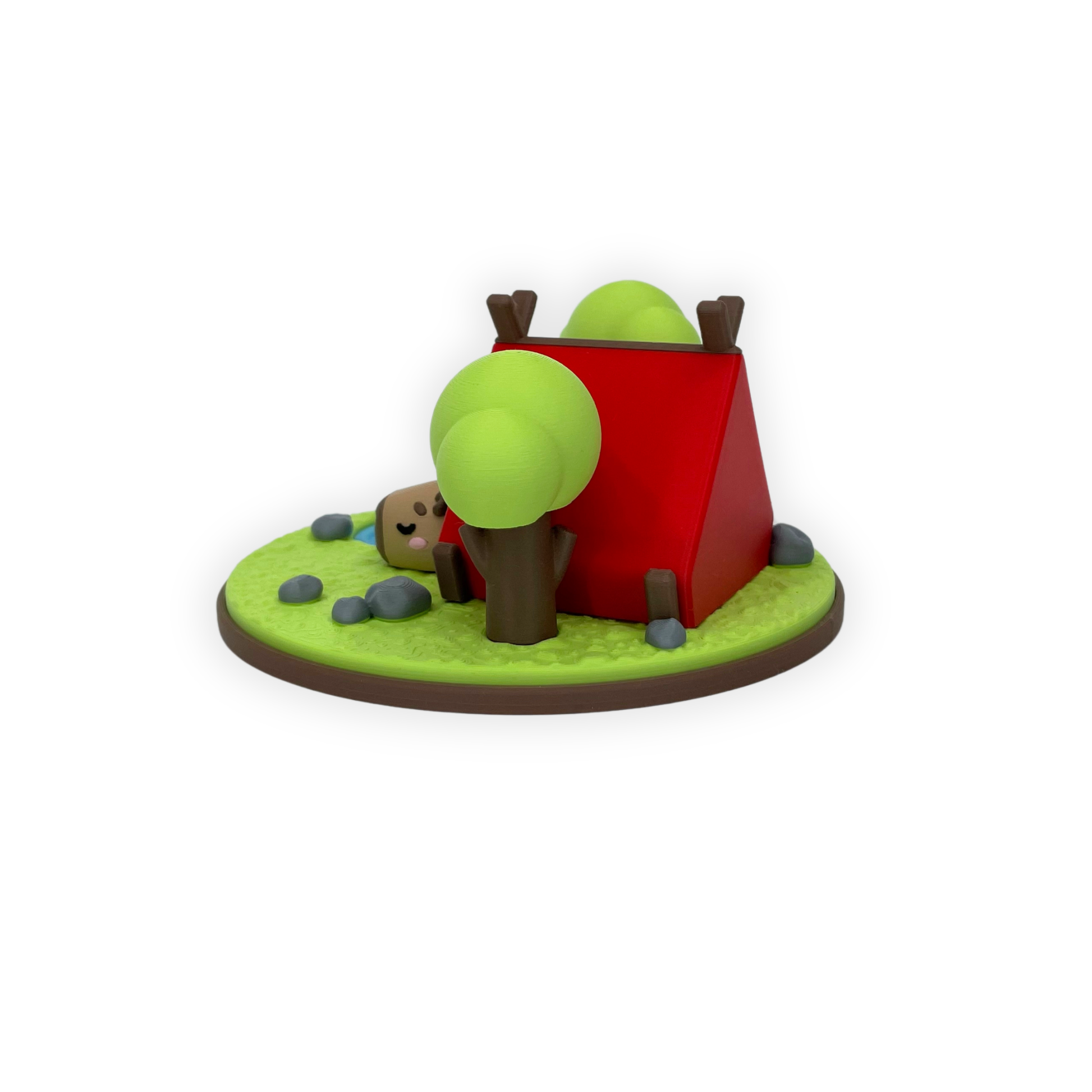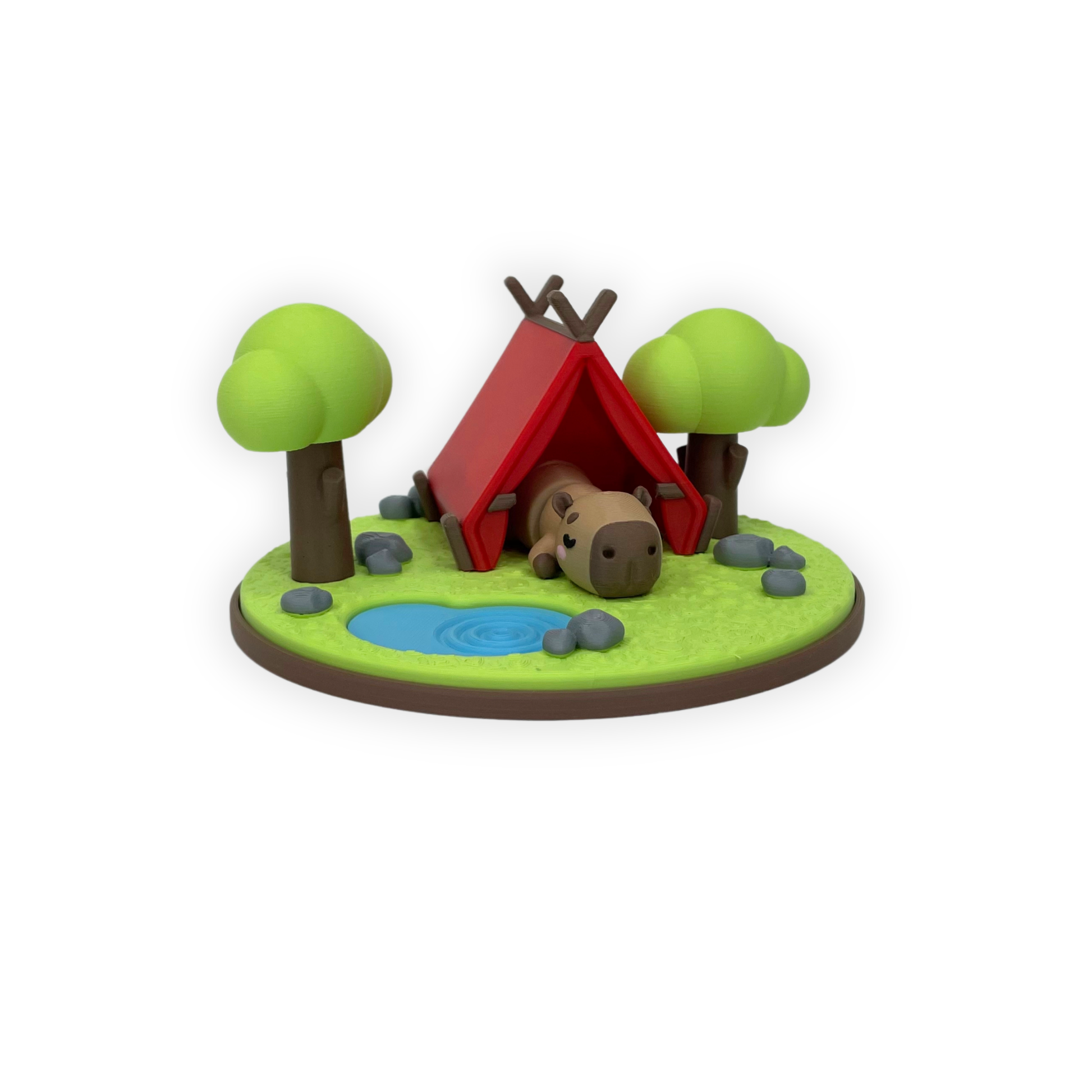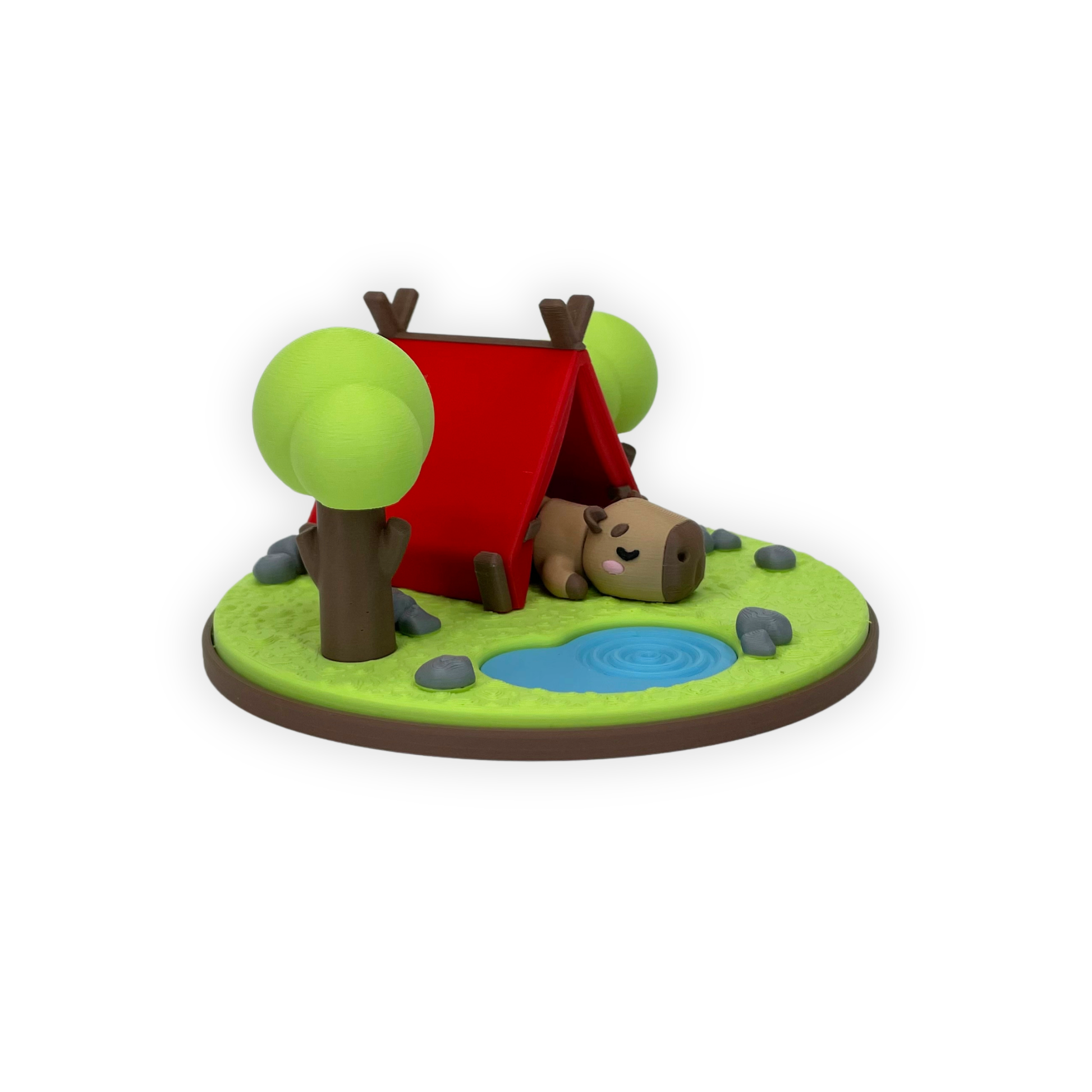 Packa fikakorgen och häng med vår mysiga lilla capybara på camping! Denna 3D-printade scen fångar en vilostund i det fria – där en capybara sover tryggt i sitt röda tält, omgiven av träd, stenar och en liten vattenpöl. En underbar detalj till skrivbordet eller hyllan som påminner om lugna stunder i naturen.