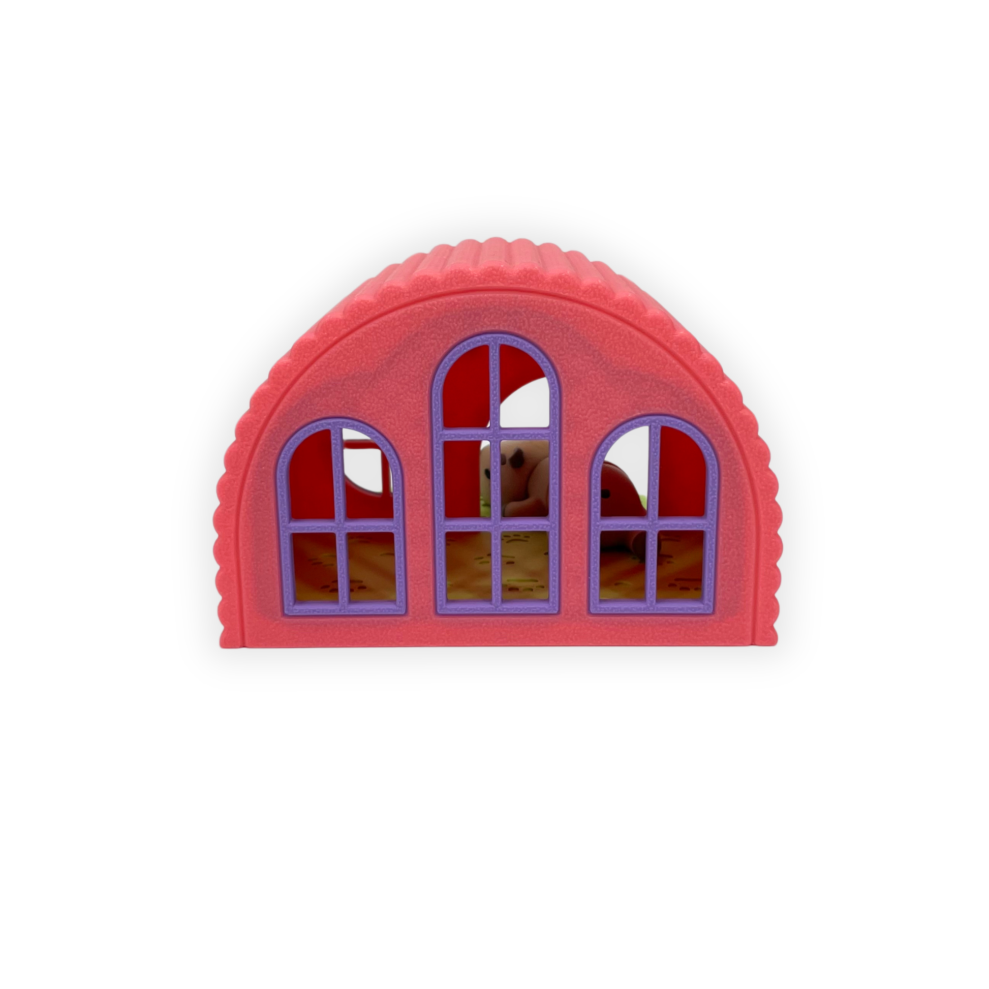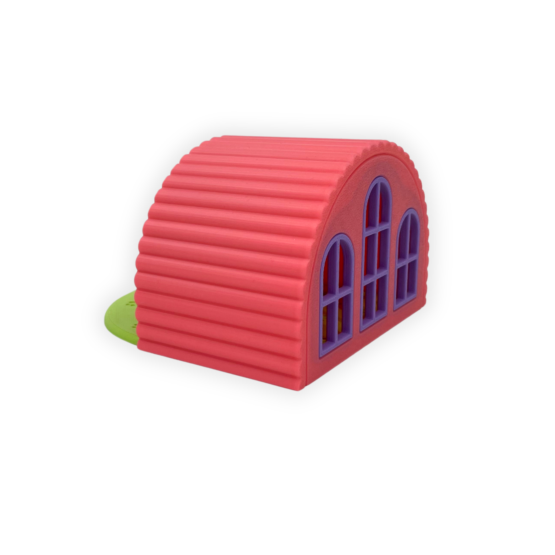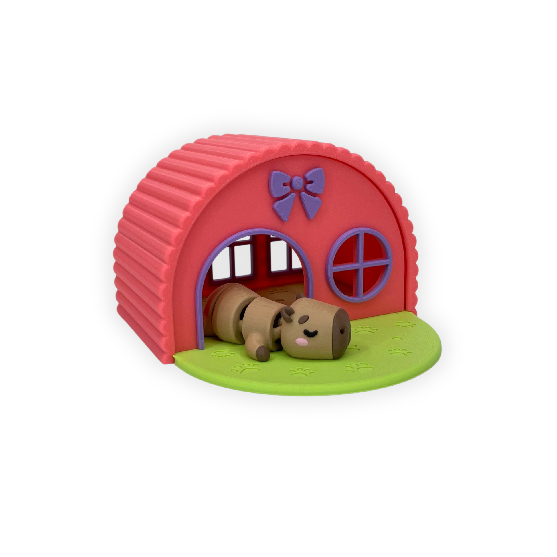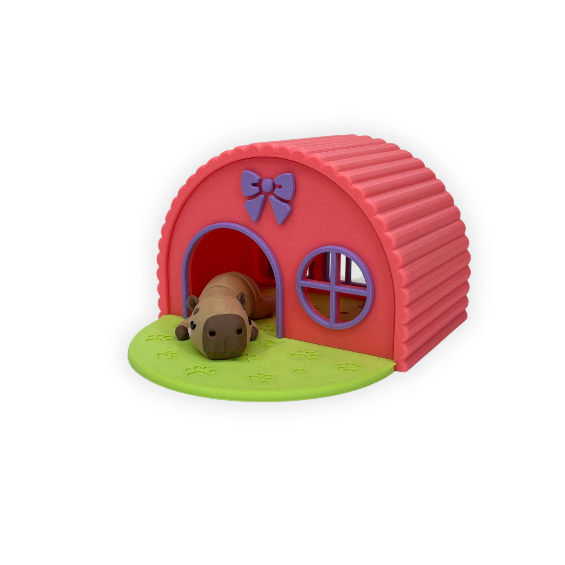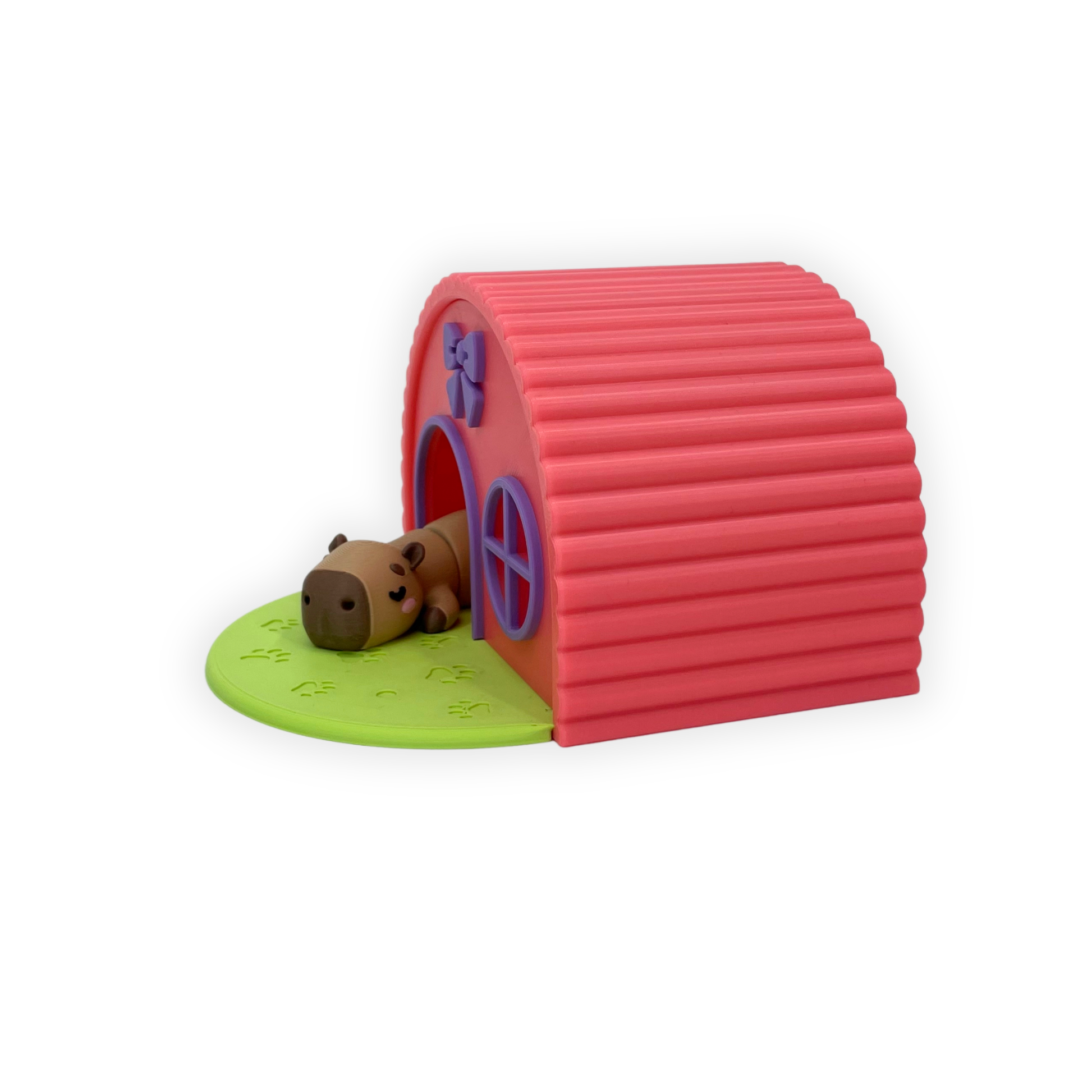Figuren är 3D-printad i PLA och består av två delar: en rundad byggnad i varma färger samt en sovande capybara framför ingången. Detaljer som fönster, tassavtryck och en söt rosett gör helheten extra levande och lekfull.