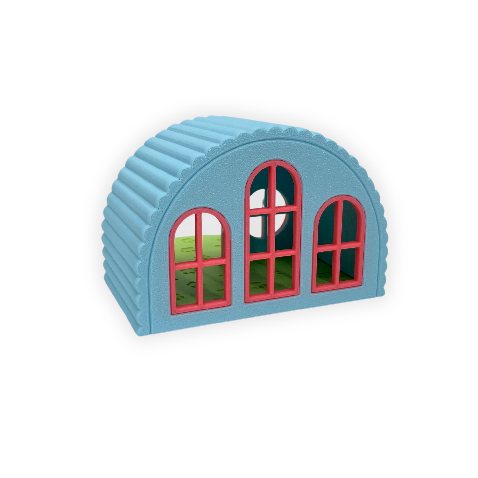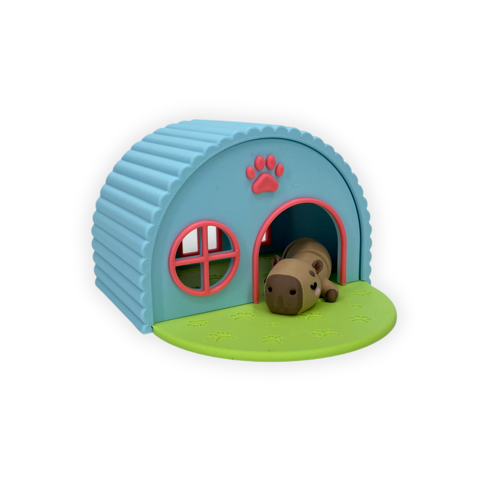 Figuren är 3D-printad i PLA och består av två delar: en rundad byggnad i varma färger samt en sovande capybara framför ingången. Detaljer som fönster, tassavtryck och en söt hundtass gör helheten extra levande och lekfull.