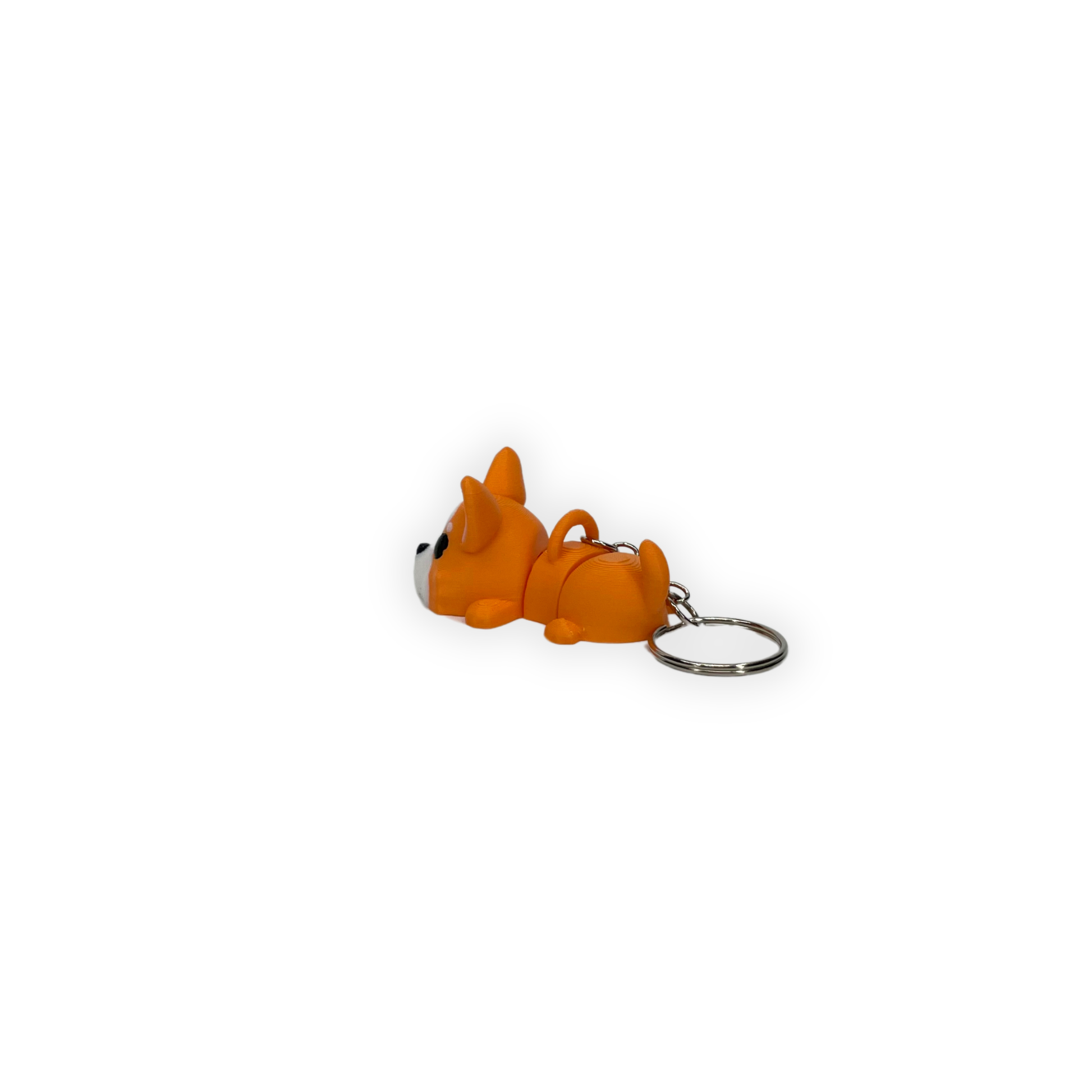 Hunden är cirka 4 cm lång och 3D-printad i PLA – en lätt och miljövänlig bioplast med en matt finish. Den ledade kroppen ger en rolig, flexibel känsla och gör figuren extra levande. En metallring ingår, så du enkelt kan fästa den där du vill.